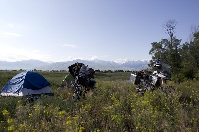 Det ble fort mørkt og ikke langt fra byen Karakul fant vi en grei campsite litt for nært veien, men valgmulighetene snevret seg fort inn nå som det ble mørkt. Vi prøver å unngå å kjøre når det er mørkt. Noen minutter etter at teltene var satt opp startet det å regne og det regnet ganske lett ca. halve natten. Ingen dramatikk med det og vi våknet av solen som traff teltduken dagen etter. Nå som den lave morgensolen skinte på fjellene var det bedre utsikt enn vi hadde sett i går. Kanskje området skulle vise seg bedre enn vi hadde trodd alikevel?