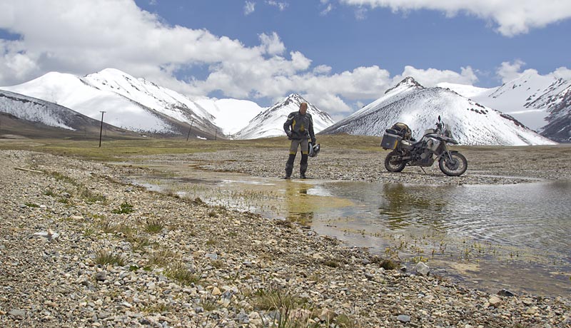 Oppe ved rundt 3800 flatet det litt ut og det åpnet seg opp. Fremdeles mange heftige topper rundt oss så fjellene her er sikkert rundt 5-6000 meter høye. Fantastisk landskap som åpner seg opp her og vi er nå oppe like ved snøgrensen. Mange fotostopp senere fortsetter vi ferden mot neste fjellpass som tar oss over 4000m. Veien ble merkbart dårligere fra krysset hvor veien delte seg mot gullgruven og mot veien vi skulle ta. Her var store hull i veien og vi måtte være våkne på hvor vi kjørte så vi ikke druste framhjulet ned i et slikt og fikk oss både en flyvetur og skader på sykkelen. Heldivis ingen problemer så langt. Vi begynte på stigningen opp de siste par hundre høydemetrene og veien ble gradvis dårligere. Dette er skikkelig offroad kjøring!!!