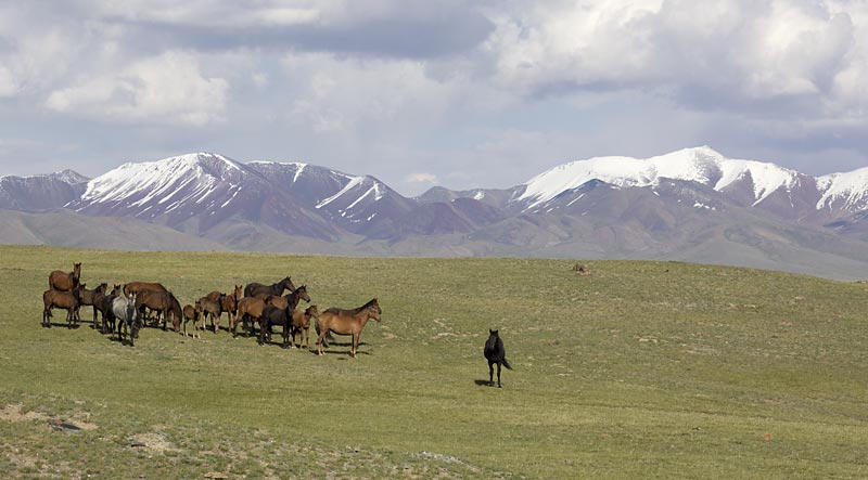 Tre personer på hest like bortenfor kommer bort for å se hva som foregår. Det er geologistudenter fra Bishek som er her på skoletur. De har leir noen km herfra og inviterer oss over. Vi kjører et stykke til og bestemmer oss etterhvert for å snu og sette kursen hjemover. Det er både av hensyn til fuel, dagslys og at vi ikke ønsker å bli stuck i dalen her dersom det kommer regn. Her er såpass mye leire og styr at blir dette vått så blir vi fast i dalen her til det tørker igjen. Jacek har ikke supre dekk for slike forhold.